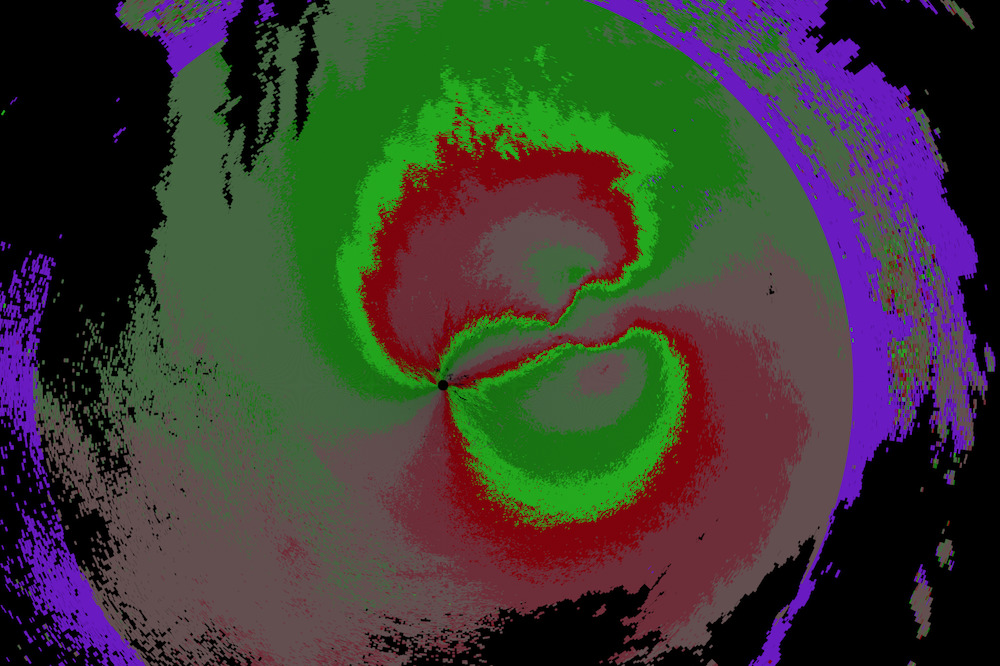 Velocity data tells you how fast a storm is moving towards or away from the radar site. Typically, in velocity products, green means things are moving towards the radar site and reds means it’s moving away. Purple means the radar timed out waiting to receive data. In the image below, you can get a sense of the counter-clockwise rotation of the storm.