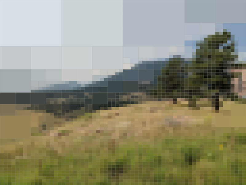 The basic idea is that you recursively divide an image into 4 quadrants. For each subquadrant, see if there’s enough color differentiation to warrant subdiving that quadrant. If there’s not enough color difference, fill it with that quad’s average color.
