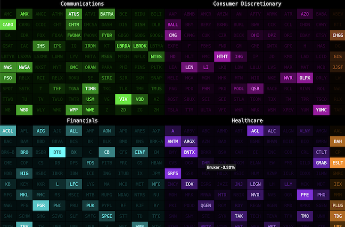 A green day on wallstreet showing the top 100 stocks by market sectors